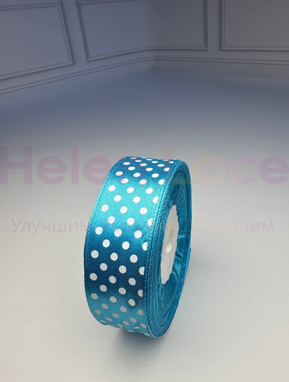 Лента атласная с принтом (горох), цвет голубой, ширина 2,5 см (25мм), бобина 23 м