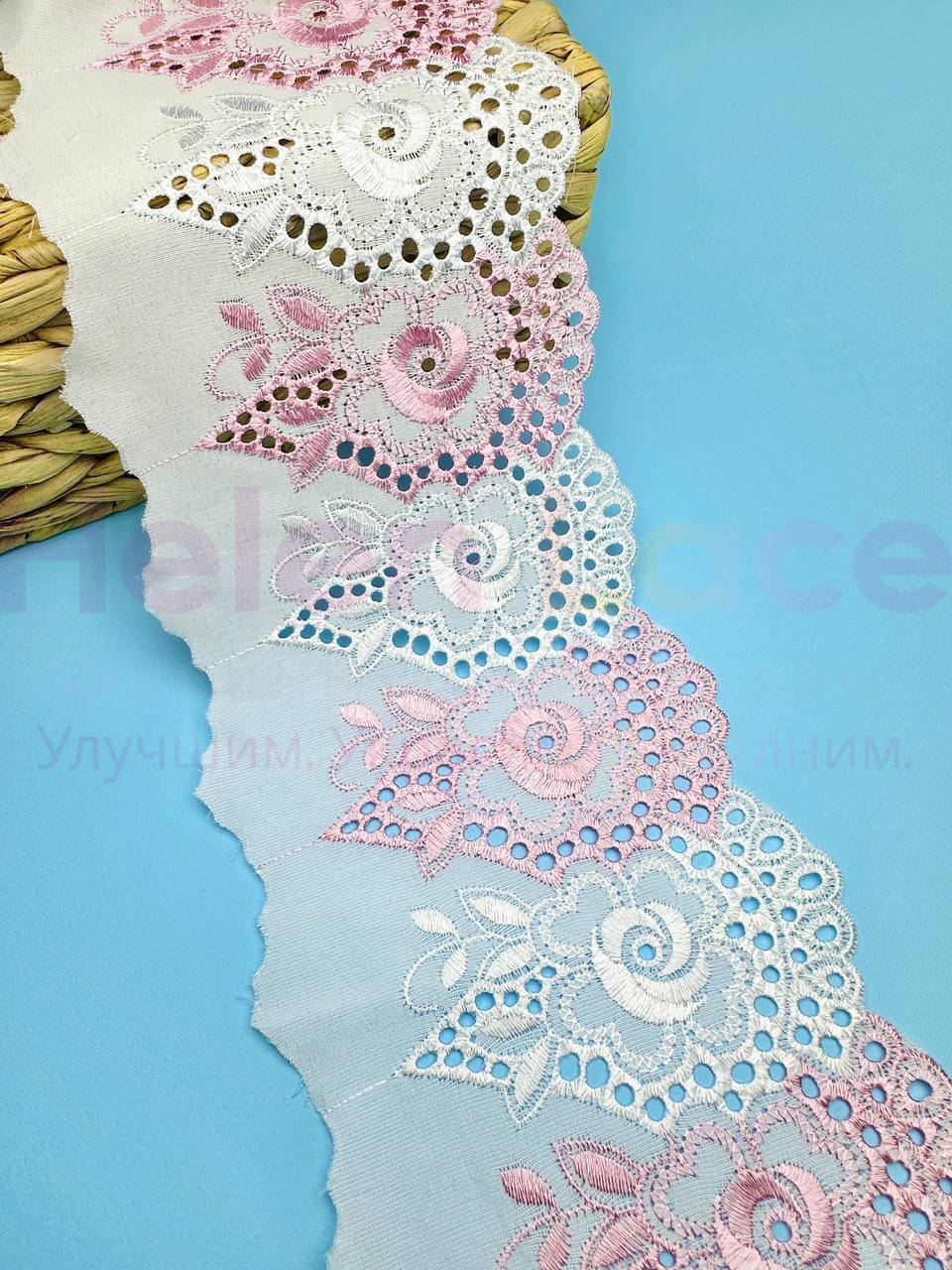 Кружево прошва с розовой вышивкой, ширина 13 см, длина 9м, PRZ19