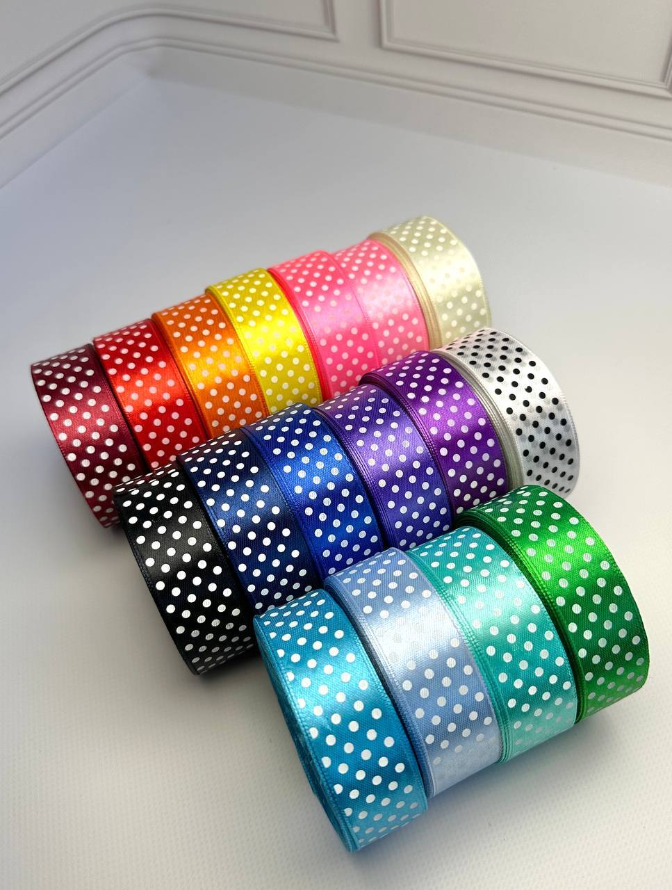 Лента атласная с принтом (горох), цвет желтый, ширина 2,5 см (25мм), бобина 23 м